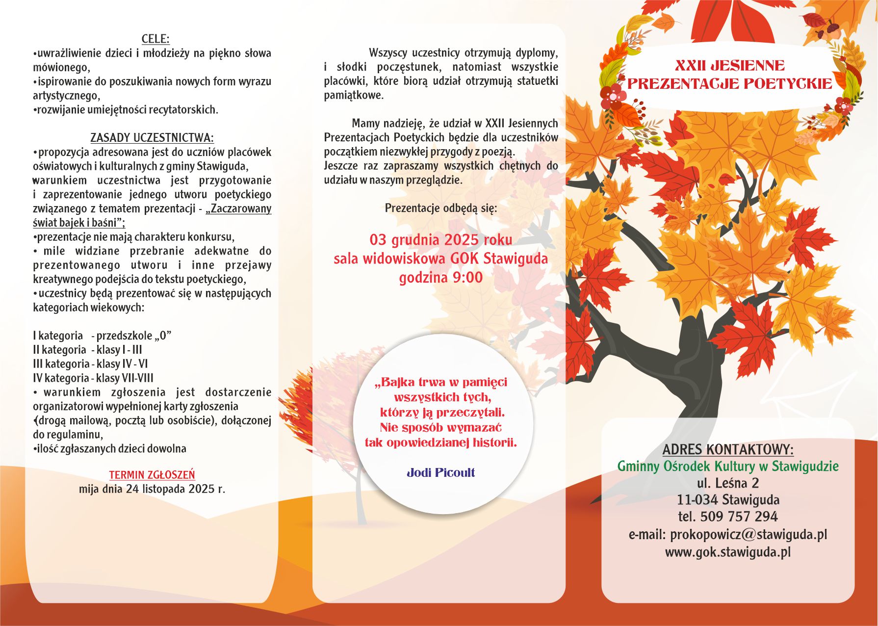Celem wydarzenia jest uwrażliwienie młodych uczestników na piękno słowa mówionego, rozwijanie umiejętności recytatorskich oraz inspirowanie do poszukiwania własnych form wyrazu artystycznego.