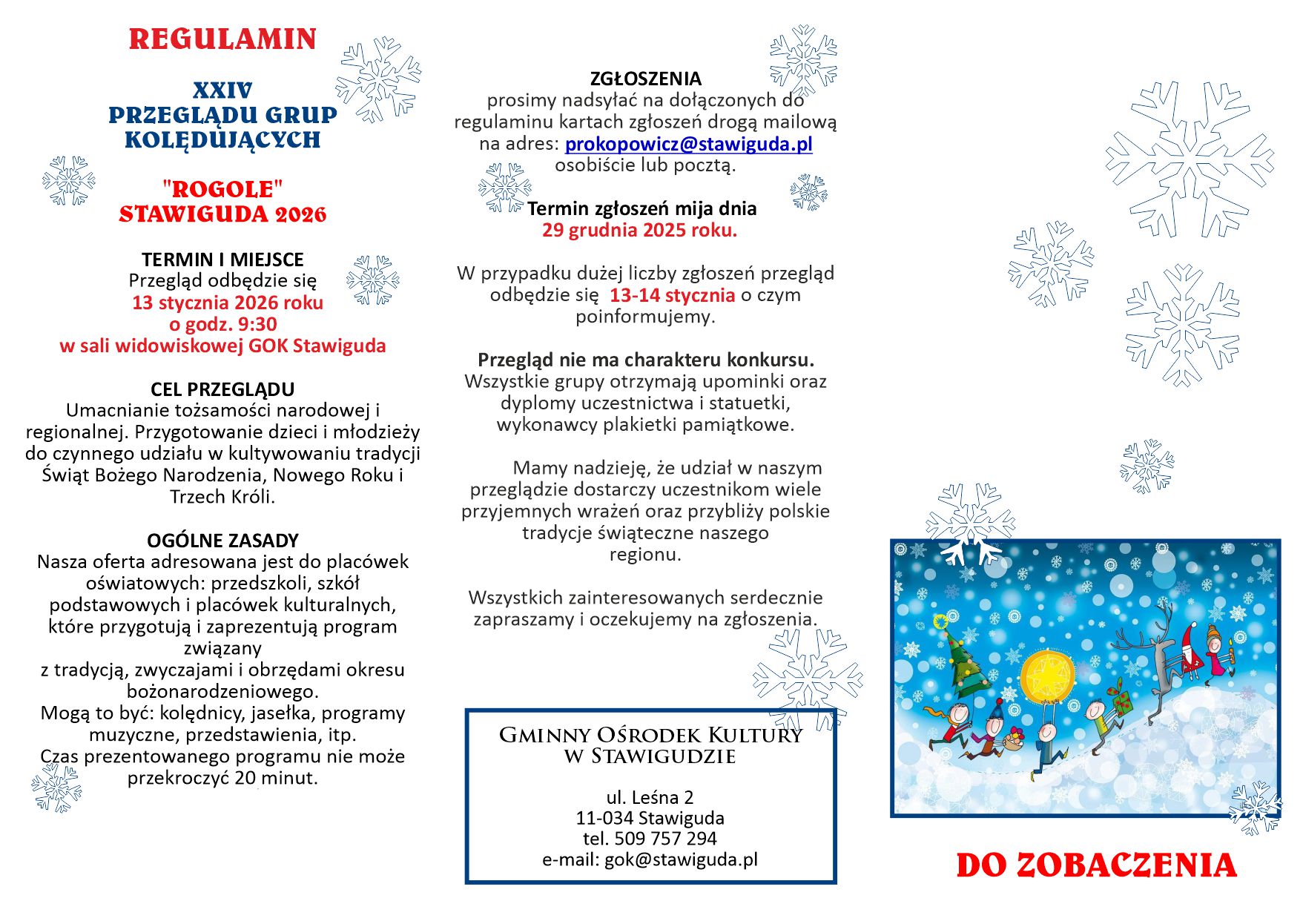 placówki oświatowe oraz instytucje kulturalne do udziału w XXIV Przeglądzie Grup Kolędujących „ROGOLE” 2026, który odbędzie się 13 stycznia 2026 roku