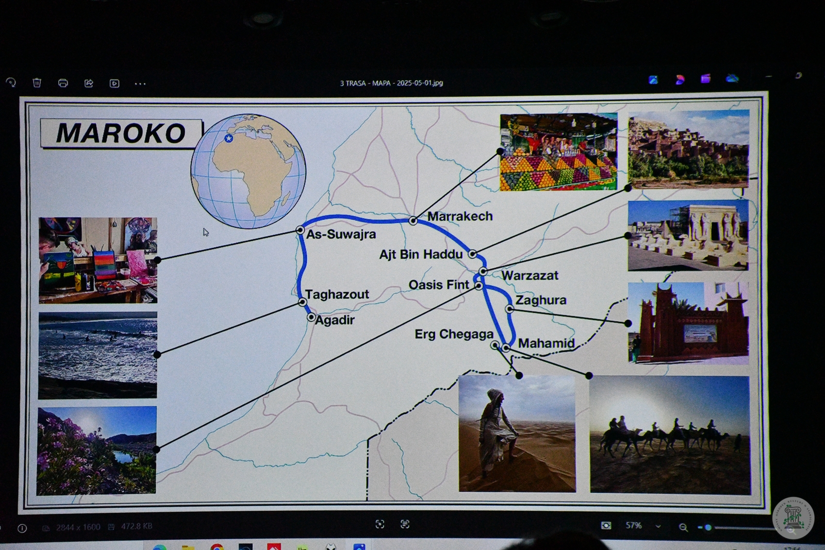 Spotkanie było pełne barwnych opowieści z południa Maroka – od tętniącego życiem Marrakeszu, przez wybrzeża Atlantyku, aż po bezkres Sahary. Prelegentka z ogromną pasją opowiadała o pustyni, kulturze Amazigh, spotkaniach z ludźmi i miejscach, gdzie czas płynie wolniej, a podróż staje się także drogą w głąb siebie. Jej historia była nie tylko relacją z podróży, ale również osobistą refleksją o wolności, uważności i sile natury.