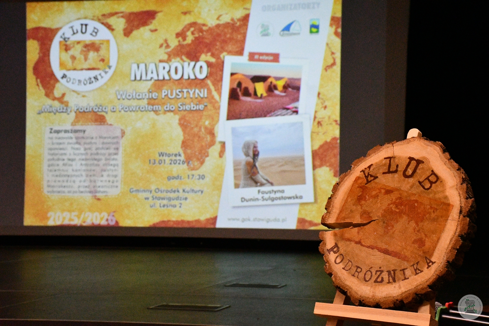 We wtorek, 13 stycznia 2026 roku, w sali widowiskowej Gminnego Ośrodka Kultury w Stawigudzie odbyło się pierwsze w nowym roku spotkanie XI edycji Klubu Podróżnika. Gościem wieczoru była Faustyna Dunin-Sulgostowska, która zabrała zgromadzoną publiczność w niezwykłą podróż do Maroka podczas prelekcji pt. „MAROKO – Wołanie Pustyni. Między Podróżą a Powrotem do Siebie”.