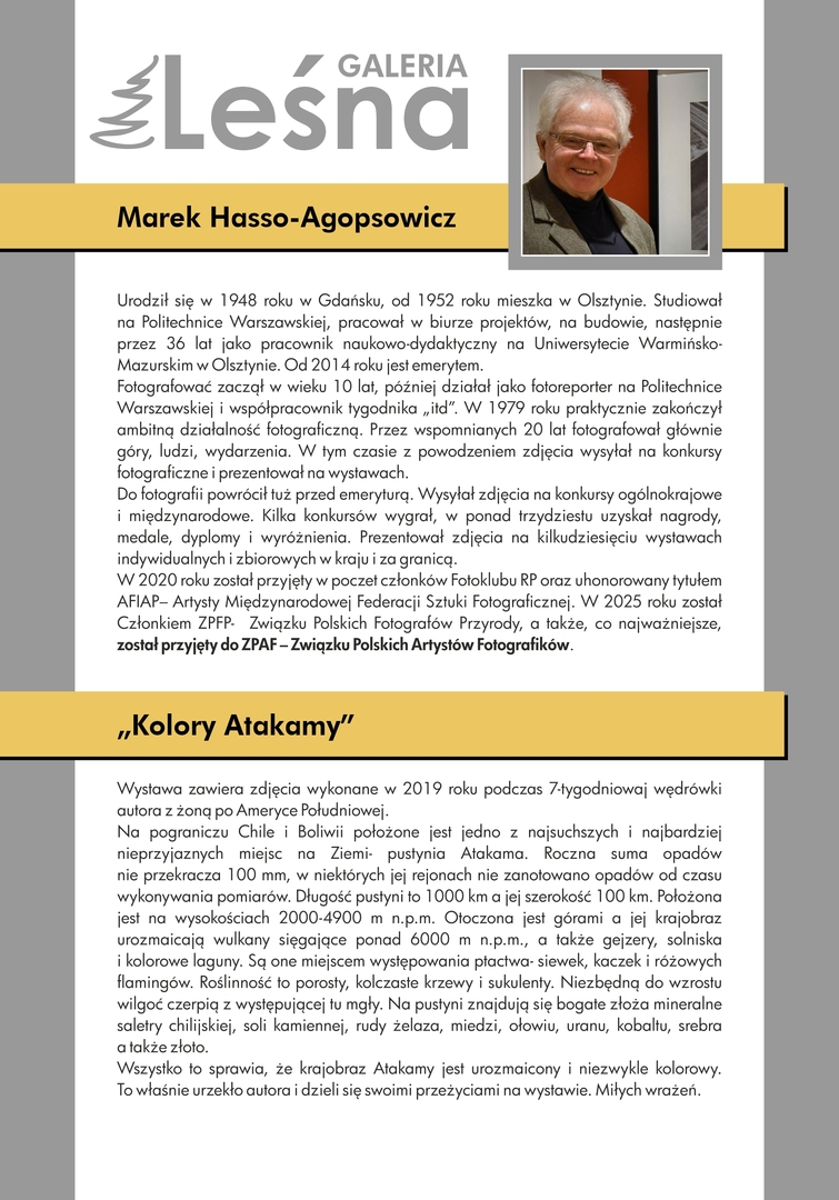 Wystawa zawiera zdjęcia wykonane w 2019 roku podczas 7-tygodniowaj wędrówki autora z żoną po Ameryce Południowej. Na pograniczu Chile i Boliwii położone jest jedno z najsuchszych i najbardziej nieprzyjaznych miejsc na Ziemi - pustynia Atakama. Roczna suma opadów nie przekracza 100 mm, w niektórych jej rejonach  nie zanotowano opadów od czasu wykonywania pomiarów. Długość pustyni to 1000 km a jej szerokość 100 km. Położona jest na wysokościach 2000-4900 m n.p.m. Otoczona jest górami a jej krajobraz urozmaicają wulkany sięgające ponad 6000 m  n.p.m., a także gejzery, solniska i kolorowe laguny. Są one miejscem występowania ptactwa - siewek, kaczek i różowych flamingów. Roślinność to porosty, kolczaste krzewy i sukulenty. Niezbędną do wzrostu wilgoć czerpią z występującej tu mgły. Na pustyni znajdują się bogate złoża mineralne  saletry chilijskiej, soli kamiennej, rudy żelaza, miedzi, ołowiu, uranu, kobaltu, srebra a także złoto.