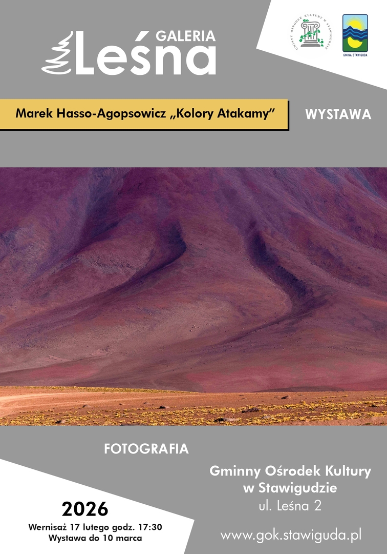 Mamy przyjemność zaprosić na wernisaż wystawy fotografii Marka Hasso-Agopsowicza. Wydarzenie odbędzie się we wtorek 17.02.2026 o godz. 17:30. Wystawa eksponowana będzie w Galerii Leśnej a rozmowa z autorem w sali widowiskowej Gminnego Ośrodka Kultury w Stawigudzie przy ul. Leśnej 2.